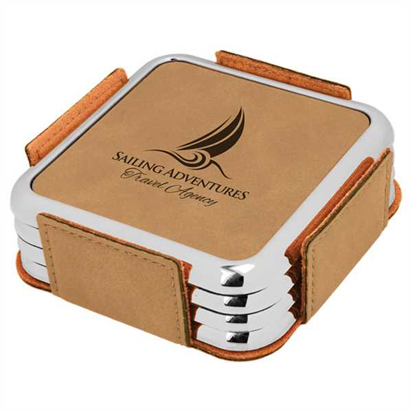 Square Light Brown Leatherette with Silver Edge 4-Coaster Set
