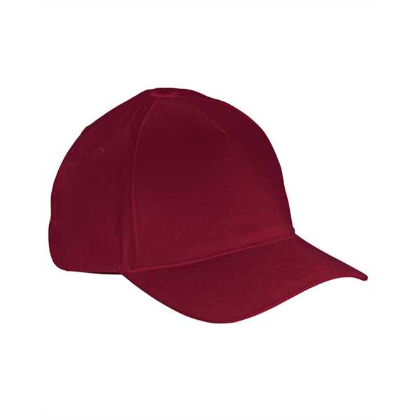 100% brushed cotton twill ; 5-panel, structured; front panel backed with buckram; self-fabric closure with brass buckle and grommet tuck-in