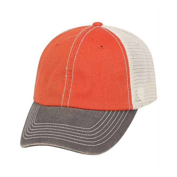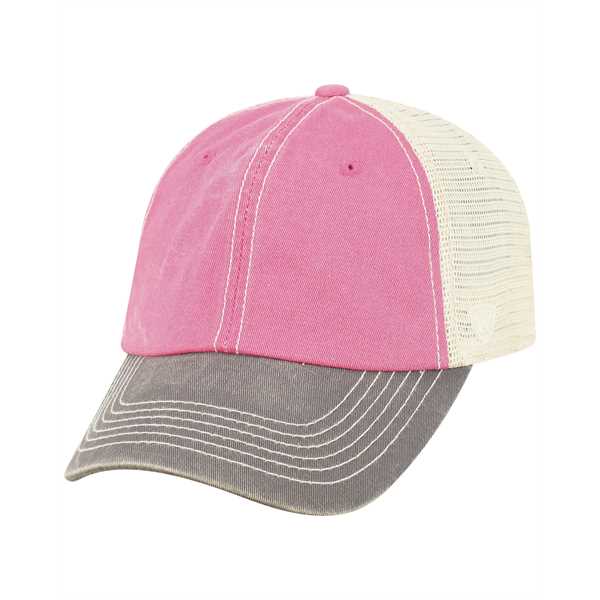 100% vintage washed cotton twill/ 100% poly soft mesh; One size fits most; 6 panel; Unstructured; Low profile; Adjustable snap-back closure