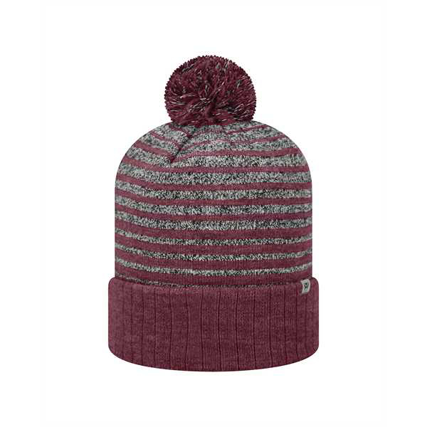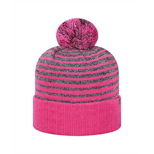 100% acrylic; One size fits most; Contrasting stripes are grey & black heather; 2-color pom