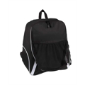 600-denier polyester; adjustable padded straps and back panel; webbing top handle; front mesh pocket with elastic binding; side mesh water bottle ; pocketimploding side shoe compartment; zippered main compartment; molded rubber zipper cord pulls; 14"W x 16.5"H x 8.25"D