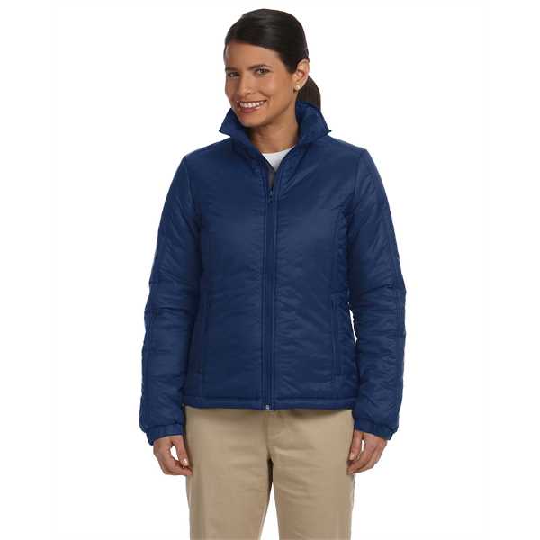 100% nylon plainweave; 100g polyfill insulation; Inside storm flap; Interior chest pocket for easy embroidery; Elastic hem cuff; Drawstring hem; Feminine styling