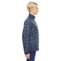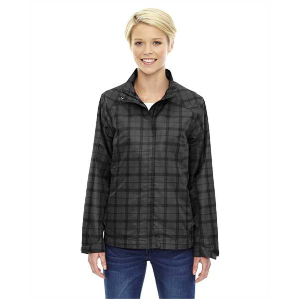 Water resistant finish; 100% polyester microfiber twill printed plaid, 4.4 oz./yd2/150gsm; LINING: 100% polyester taffeta with embossed print; stylized storm flap with metal snaps at top and bottom; inside facing pocket with welt; inside security pocket with invisible zipper and audioport; adjustable cuffs with tabs ; back waist adjustment with tabs and metal snaps