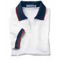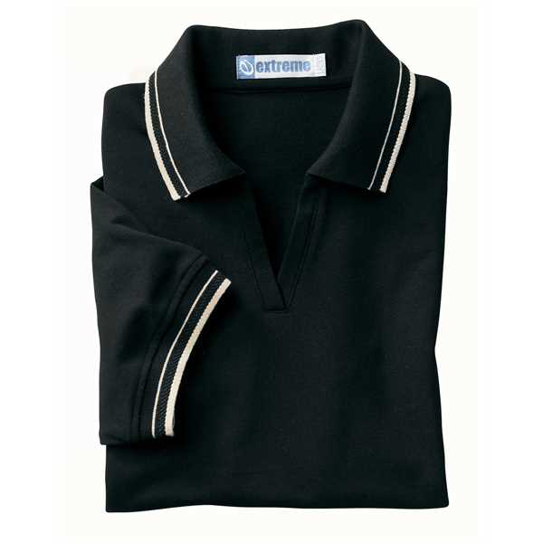 100% combed cotton pique, 6.3 oz./yd2/215 gsm; UV protection performance ; Johnny collar neckline; Textured stripe flat knit collar and cuffs