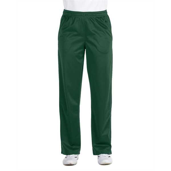 7.8 oz., 100% polyester tricot, 75-denier; Raised inner nap; Elasticized waistband with drawcord; On-seam pockets; Open-bottom hem; Extended zippered legs