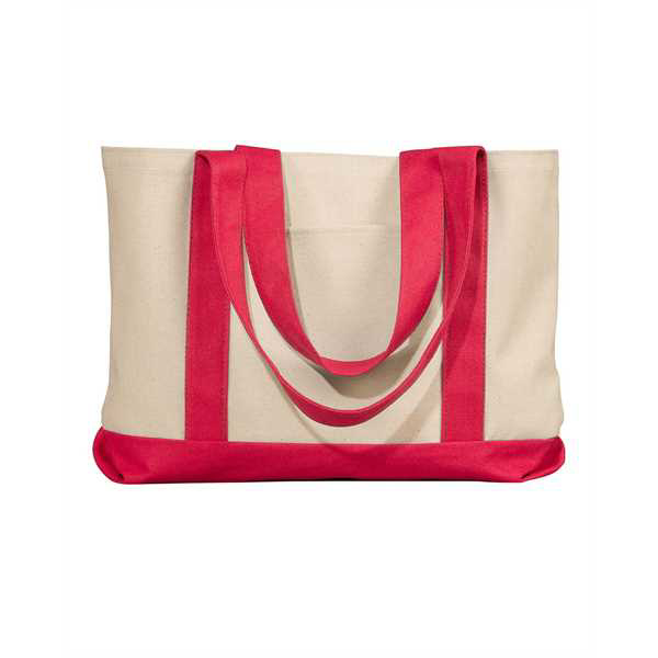 11 oz., 100% cotton canvas; contrasting self-fabric handles; outside pocket; contrasting gusseted bottom