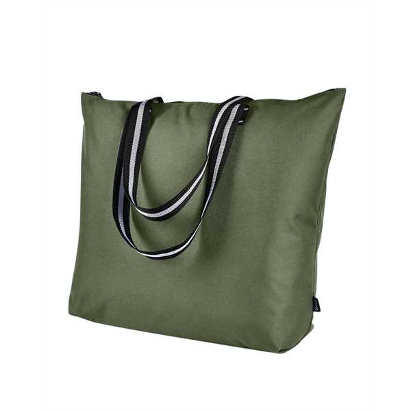 600D polyester; Jumbo multi-purpose tote perfect for trade shows, travel, the beach and more; Zippered closure to the large main compartment; Interior pocket for storing accessories; 25" shoulder straps; Kid friendly; 20"W x 15"H x 5.5"D