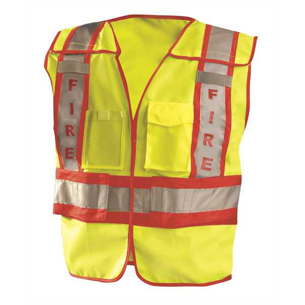 100% ANSI polyester tricot; Pockets: 1 clear badge chest, 1 radio, and 2 microphone tabs; Hook & loop closure; Dual sized; 2 front logos / 1 back logo on reflective patch; 3M™ Scotchlite™ reflective material