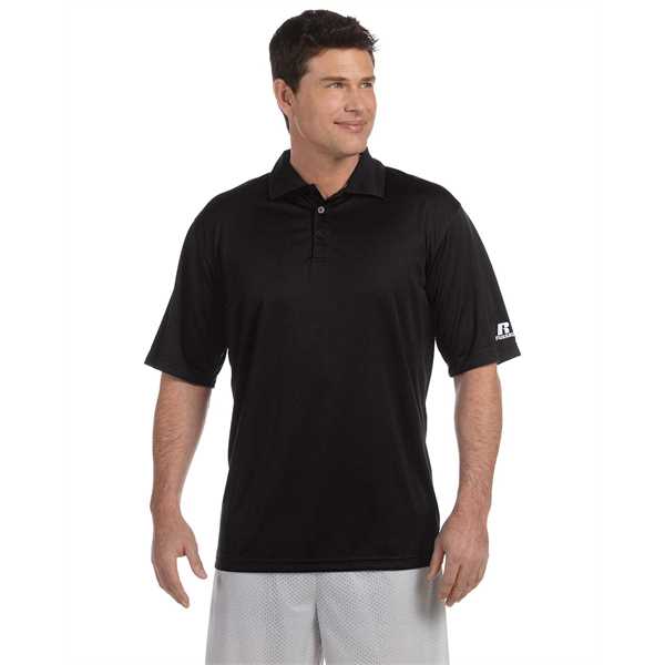 4.1 oz., 100% polyester; Dri-Power® moisture-wicking fabric; self-material collar; neck taping; three-button placket; set-in sleeves; "R" Russell on left sleeve; side vents