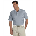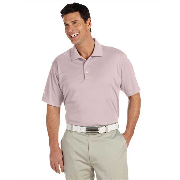 4.3 oz., 100% polyester; sideseamed with drop tail and side vents; three-button placket; rib knit collar; open-hem sleeves; contrast adidas brandmark on right sleeve