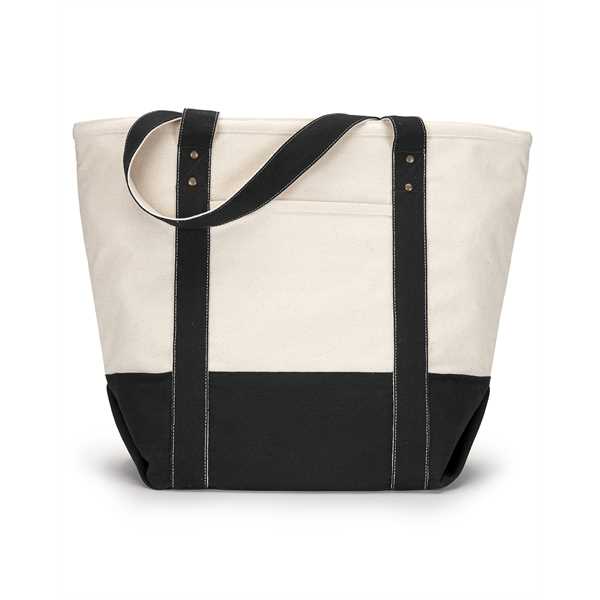 16 oz. sturdy cotton canvas; 23" reinforced webbed handles; Large zippered main compartment; Front slash pocket; Zippered interior pocket; Antique brass rivets; 5"w x 4 ½"h approx. front pocket center imprint area; 3"w x 2 ½"h approx. front pocket center embroidery area