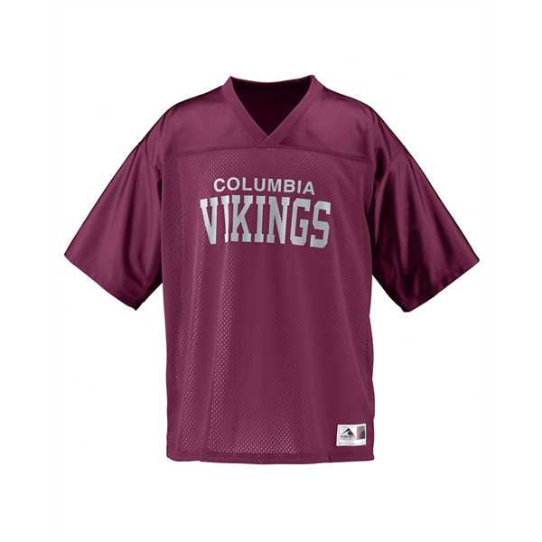 3.4 oz., 100% polyester tricot mesh ; 100% polyester dazzle fabric yoke and sleeves; 1x1 rib-knit modified V-neck collar; Front and back yoke large enough for embellishment; Set-in sleeves; Outside locker label with size on left side near bottom hem; Double-needle hemmed sleeves and bottom