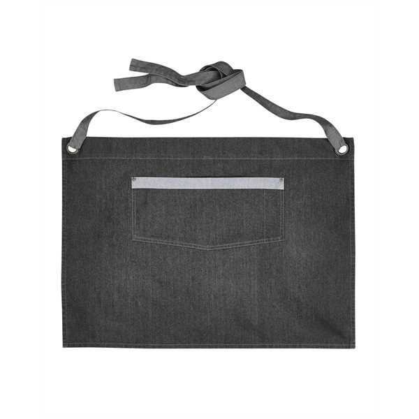 9.3 oz., 70% cotton, 30% polyester; 14" wide centre pocket with reverse contrast trim; combined pen pocket; metal eyelets secure 39" contrast fabric ties; 20" L x 28" W; Oeko-Tex® Standard 100 certified; WRAP certified