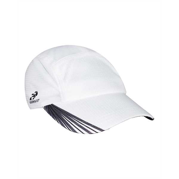 100% polyester eventure grid shell ; Wrapped Eventure terry sweatband; Classic style, superior run-hat fit; Black undervisor to reduce glare; Flat front panel perfect for custom logo application; One size fits most - adjustable rear buckle with ponytail opening; Machine washable, air dry, does not shrink