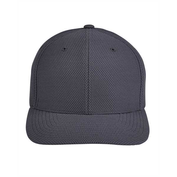 7.67 oz/yd2 / 260 gsm, 96% polyester, 4% PU spandex hybrid 3D diamond jersey; Moisture-wicking; UV protection performance; 6 panel, structured, mid-profile; Heavy buckram in front panels; Sewn eyelets; Patented spandex sweatband retains shape