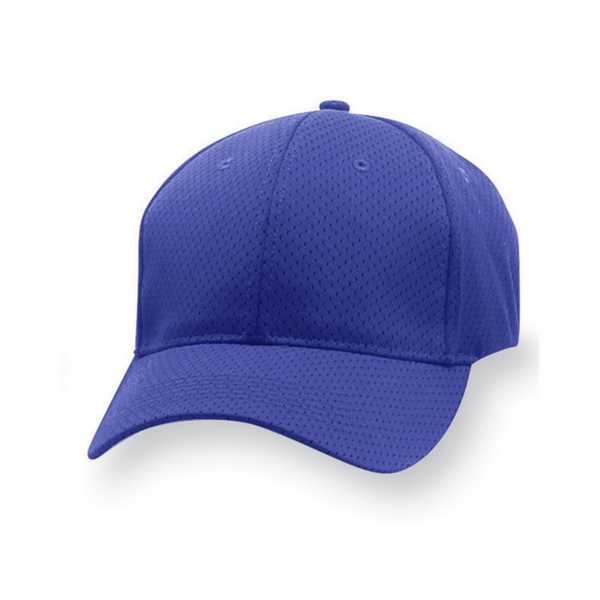 100% polyester athletic mesh with tricot backing; Unique design allows cap to stretch for comfortable fit; Six panels; Low profile pro-style crown; Fused buckram-backed front panels; Matching sewn eyelets; Pre-curved bill with contrast grey undervisor